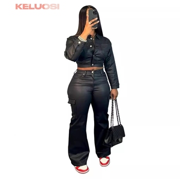 Pantaloni svasati in pelle nera 2 pezzi Set abbigliamento donna giacca e campana fondo due pezzi abiti